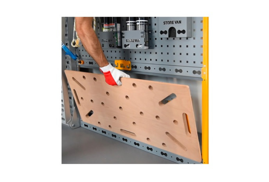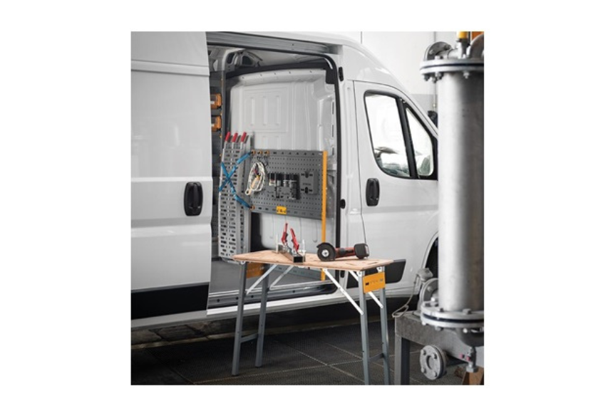 - Oltre ai pannelli forati portautensili, la copriparatia per furgoni può ospitare il banco da lavoro pieghevole con piano in legno forato e gambe in metallo. Inserito all’interno della copriparatia, occupando lo spazio inutilizzato che intercorre tra la paratia stessa e la parete del retrocabina, il tavolo da lavoro pieghevole può esser estratto e trasportato facilmente e velocemente anche all’aperto. La capacità di carico è pari a 150 kg