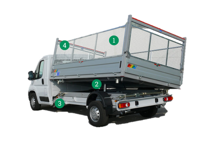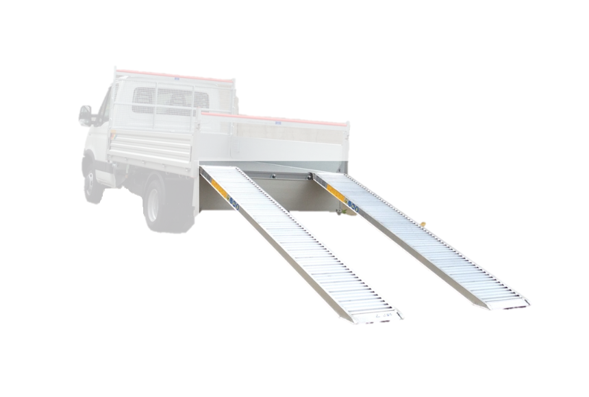 - Cassone ribaltabile trilaterale con piano in acciaio e rampa di salita in alluminio senza bordo, lunghezza 3000mm, larghezza 310mm. Portata indicativa 1300 kg