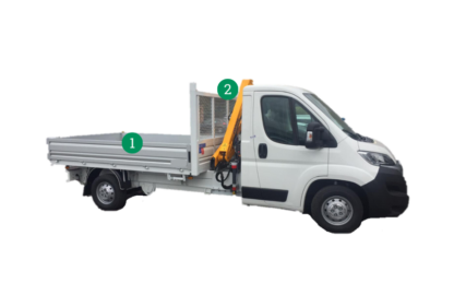 - Gru idraulica Bonfiglioli modello A2 con due sfili idraulici: momento massimo di sollevamento 2,55 TM; sfili idraulici con lunghezza massima di 6100 mm in orizzontale e capacità in punta di 400 kg; portata fuori cassone limitata per CE a 990 kg;