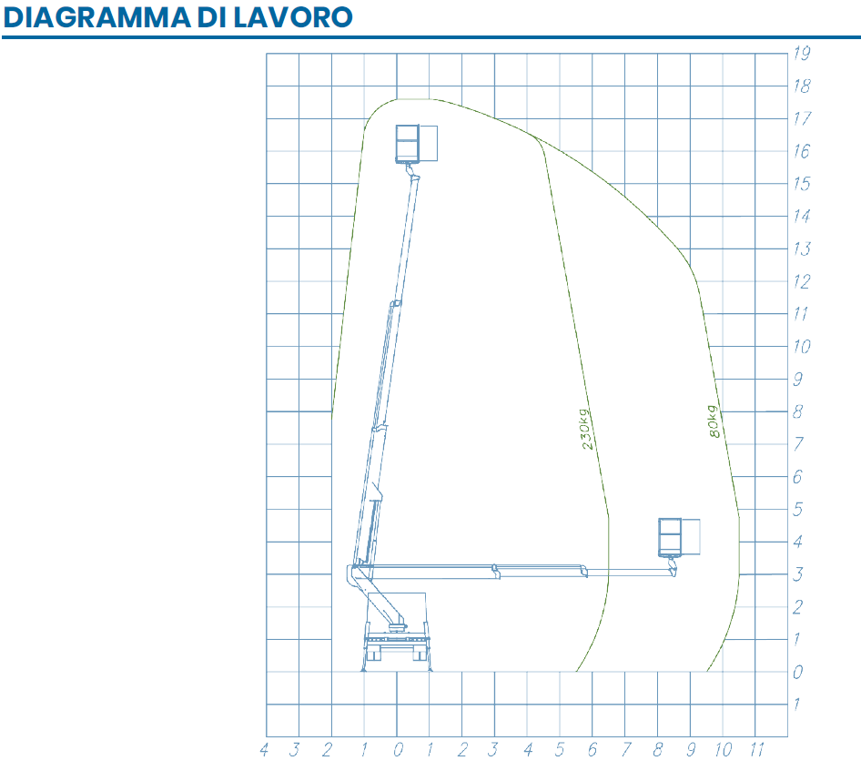 - Cestello in alluminio: 1400 x 700 x 1100 mm. Portata massima 230 Kg.